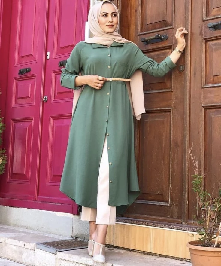 وهناك أيضا الدريس الطويل باللون الرصاصي الفاتح المصنوع من قماش الميلتون، والذي لا يخلو منه دولاب أي فتاة أو سيدة محجبة، وهو مناسب أيضا للفتاة غير المحجبة، ويعد عمليا جدا ويمكنك ارتداؤه وأنت ذاهبة للجامعة أو العمل، وتنسيقه مع طرحة باللون الأخضر وشنطة خضراء أيضا بنفس لون الطرحة مع حذاء باللون الأبيض.